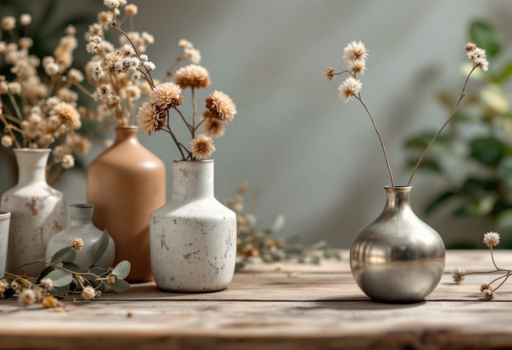 Les boutons usagés représentent également une option fascinante pour orner un vase. En variant leurs tailles, formes et couleurs, tu obtiendras une mosaïque éclatante, propulsant un simple récipient au rang d’œuvre d’art. Même orientation avec les perles ou les coquillages ramassés durant les vacances, chacun étant attaché avec soin pour rappeler des souvenirs estivaux.
