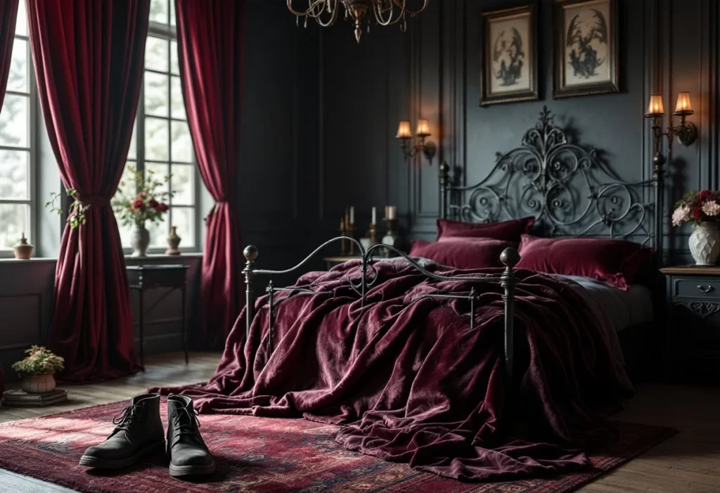 Velours, fer forgé et semelles épaisses : le trio gagnant pour une chambre gothique